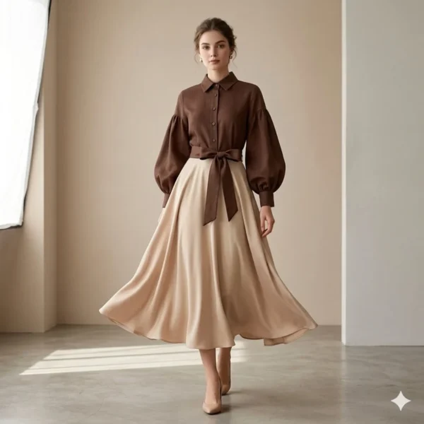 الوصف: هذا الفستان مصمم ليعطيك إطلالة راقية ومتوازنة بدون أي مجهود. الجزء العلوي بقصة أنيقة وأكمام واسعة يضيف لمسة أنثوية ناعمة، بينما التنورة الواسعة الانسيابية تعطي حركة فخمة وجذابة مع كل خطوة.